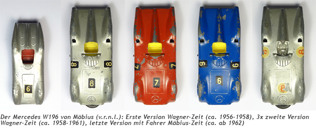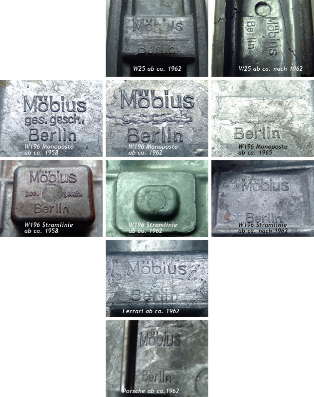 Ein weiteres besonderes Merkmal dieser Modellgeneration ist die Markung der W196-Versionen in der Unterseite mit “Möbius ges. gesch. Berlin”. Außerdem besaßen alle Modelle neue Felgen – nicht mehr mit dem kleinen Strich, sondern einer leichten Gussnaht, die als Linie über den ganzen Durchschnitt läuft. Die angedeuteten Bremstrommeln haben nun innen Rillen, die wohl Bremsscheiben andeuten sollen. Auch die Startnummern des W196 hatten sich geändert: nun weiße Zahlen auf schwarzem Rechteck mit runden Ecken. Die Rechtecke waren etwas länglicher und es wurde eine andere Typo verwendet.