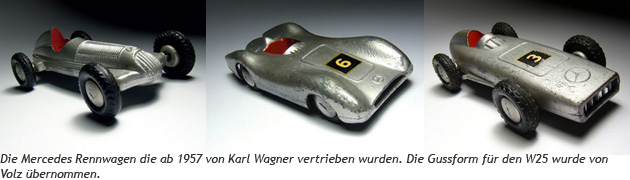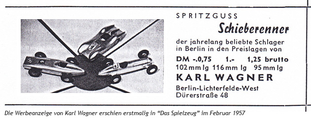 Mitte der 1950er Jahre musste Volz sein Geschäft und damit den Verkauf der Autos aufgeben. Karl Wagner übernahm die Gussform des W25 und vertrieb diesen weiter. Doch dabei blieb es nicht. Bald erweiterte Wagner das Sortiment durch den Mercedes W196 Stromlinie und W196 Monoposto, stellte diese wiederum in “Das Spielzeug” 1957 vor und bewarb diese mit einer Anzeige. Zu sehen ist der kleine W196 mit dem Berlin-Wappen. Dieses Modell gab es auch mit Startnummern, so wie sie auch der W196 Monoposto hatte. Alle Autos hatten nun die von mir so genannten “Strichfelgen”. Die Formen für diese Modelle kamen wieder von Möbius.