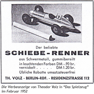 Die Kenntnisse über die Personen, mit denen Möbius damals zusammenarbeitete, verdanken wir heute ausschließlich Axel Kirchner. Er begann Ende der 1990er Jahre intensiv zu recherchieren. Schnell stellte er fest, dass es schwierig werden würde, etwas über den Hersteller der Bordsteinrenner herauszufinden. Er befragte viele Händler in Berlin, recherchierte im Landesarchiv, in der Landesbibliothek, beim Patentamt, bei der IHK und in alten Spielzeugläden – vergeblich. Doch er gab nicht auf und durchforstete das Archiv des Verlages Meisenbach in Bamberg, dem Herausgeber des Fachmagazins “Das Spielzeug”. In den Jahrgängen der 1950er Jahre stieß er schließlich auf Neuvorstellungen und Werbeanzeigen mit Fotos der gesuchten Spielzeugautos aus Berlin. Doch die Inserenten waren ein gewisser Theodor Volz und später Karl Wagner. Kein Möbius! Schließlich gelang es Axel Kirchner, im Jahr 2000 mit Karl Wagner in Berlin in Kontakt zu treten, ihn in seiner Wohnung in Berlin-Steglitz zu besuchen und zu befragen. So verdanken wir dem Autoren des Artikels “Schieberenner – Rundenjagden vor der Haustür” in der Spielzeug-Revue 6/2000 das Wissen über die Akteure. Und über die Umstände der Möbius-Geschichte, die ich hier nun nochmals versuche darzustellen, kombiniert mit dem Wissen über die vielen Modellversionen.