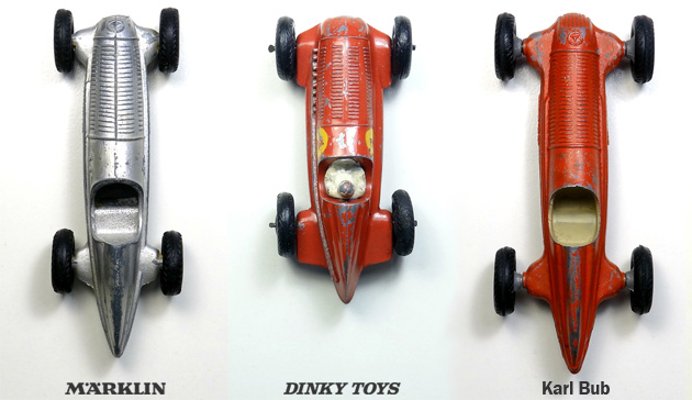 Die erste Form des W25, der von Volz vertrieben wurde, besitzt außerdem eine verblüffende Ähnlichkeit zu einem Modell eines anderen Herstellers. Es ist der Mercedes W25, den wir mit seiner Bezeichnung KB4 heute Karl Bub zuschreiben. Beide Modelle sind sich so ähnlich, dass man sie fast als Zwillinge bezeichnen könnte. Ein paar Unterschiede gibt es freilich. So ist das Auto von Möbius etwas kleiner. Aber skaliert man den Wagen von Möbius auf die Größe des KB4, so sind in der Draufsicht keine Unterschiede zu sehen. Im Profil fällt lediglich auf, dass der kleinere Möbius keine Lüftungsschlitze hinter den Vorderrädern auf der unteren Form besitzt, so wie der KB4. Wahrscheinlich böte die Verkleinerung auch kaum Platz für dieses Detail. Die Qualität der beiden Versionen ist etwa gleich. Auch wenn der KB4 häufig an der Zinkpest leidet und man heute nur schwer intakte Exemplare findet.
