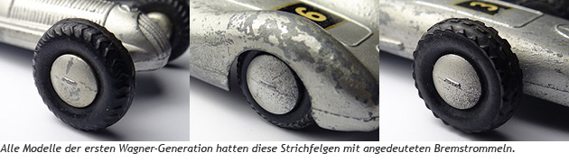 Dieser W196 mit den Kühlrippen besitzt Reifen, die als Ersatzreifen von Märklin unter der Nummer 8153 verkauft wurden. Diesen Hinweis gab mir Axel Kirchner. Interessant ist aber auch, dass ich zwei Exemplare dieses W196 mit diesen Reifen besitze, die ich unabhängig von einander gekauft habe. Außerdem habe ich auch schon einen W 25 aus der gleichen Zeit mit den gleichen Reifen gesehen. Für diese Besonderheit könnte es verschiedene Erklärungen geben. Etwa, dass solche Reifen eine besondere Art des Tunings war und es viele Nachahmer gab. Vielleicht hat auch Wagner während eines Engpasses der normalerweise verwendeten Reifen nach einer Zwischenlösung gesucht und griff dann auf die Reifen von Märklin zurück. Gegen die erste These spricht aber der Zustand des hier abgebildeten W196 Monoposto. Er ist nahezu unbespielt. Und die zweite These lässt sich natürlich nicht mehr beweisen. So bleibt wohl auch dies ein Rätsel, welches wir, wie einige andere im Zusammenhang mit Johannes Möbius, vermutlich nicht mehr lösen werden.