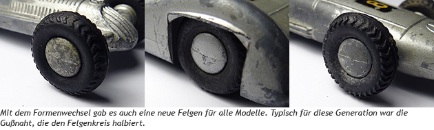 Der plötzliche Modellwechsel ist rätselhaft und es könnte verschiedene Gründe dafür geben. Die Formen für die Fahrzeugkörper und Felgen könnten verlorengegangen oder zerstört worden sein, zum Beispiel durch einen Brand in der Gießerei. Aber das ist natürlich nur Spekulation und Karl Wagner hätte ein solch einschneidendes Ereignis sicher Axel Kirchner gegenüber erwähnt. Ich bin mir aber sicher, dass es sich hier nicht einfach nur um Modellpflege gehandelt hat. Denn dann hätte man wohl eher weitere andere Modelle herausgebracht und nicht die gleichen. Die Felgen der Vorgängermodelle hätte man auch gut für die neuen Modelle nutzen können. Und warum schließlich sollte man die Form des W25 durch eine qualitativ schlechtere ersetzen?
